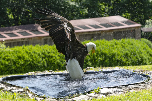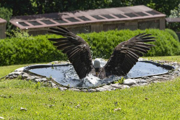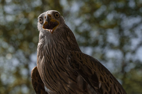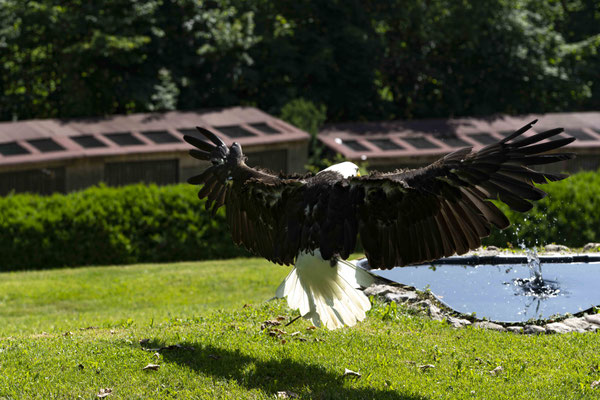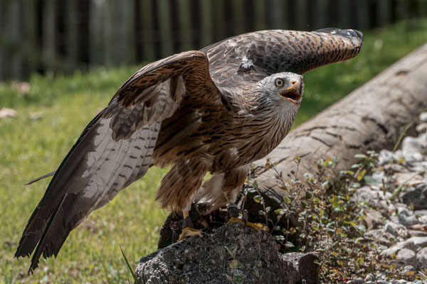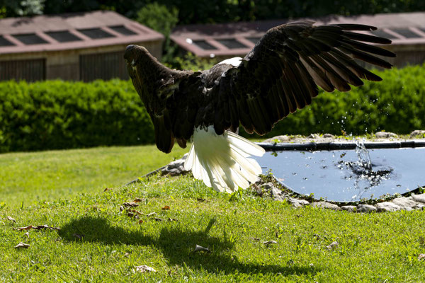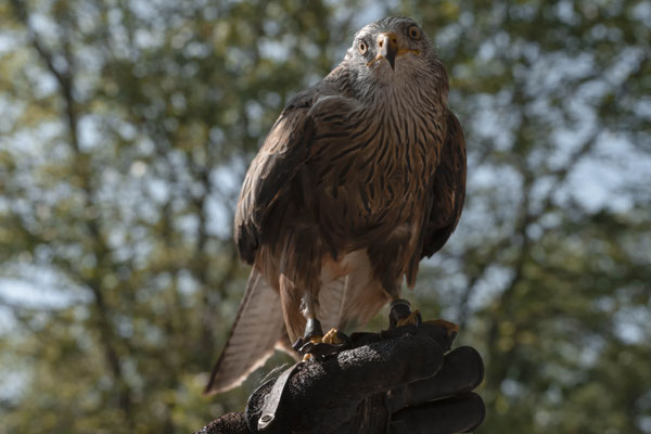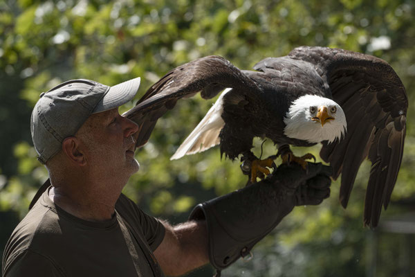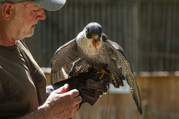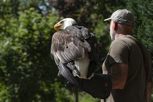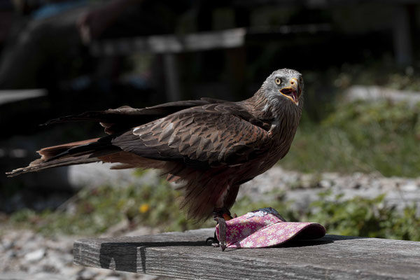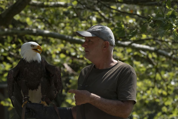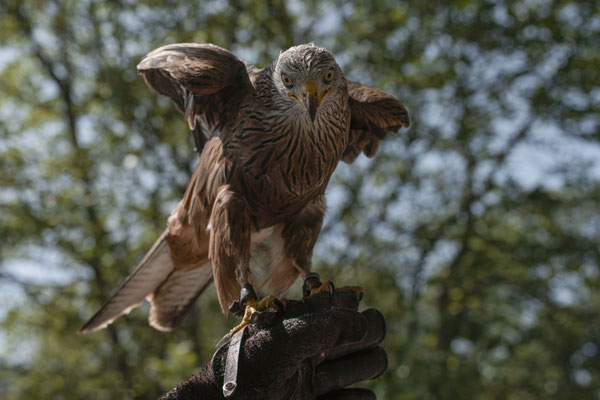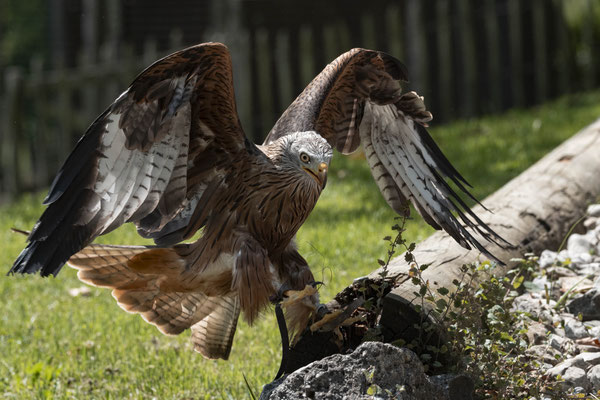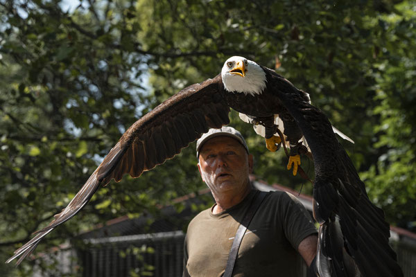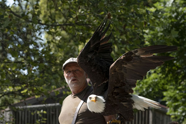 Wenn das Wetter mitspielt - es regnet nicht und ist nicht zu stürmisch, dann bleiben die Hauptdarsteller in ihren Volieren - ist der Besuch in der Falknerei Burg Hohenaschau im Chiemgau ein beeindruckendes Erlebnis. Während der zweimal täglich stattfindenden Flugvorführungen werden die Besucher in die Geheimnisse der Greifvogelwelt und der Beizjagt eingeführt. Die atemberaubenden Flugvorführungen von Rotmilanen, Falken, Bussarden und dem großen Weißkopfseeadler können hautnah miterlebt werden. Dabei ist die Flugshow ebenso lehrreich wie humorvoll. Ich hatte den Eindruck, den Greifen ging es nicht nur um den Leckerbissen nach jedem Flug, sondern sie hatten bestimmt auch selbst Spaß dabei. ihre Flugkünste vorzutragen. Insbesondere auf den Köpfen von Besuchern zu landen oder im Vorbeiflug ein Käppi zu stibitzen. Fotografisch sind die Greifvögel eine echte Herausforderung. Es ist mir nicht so richtig gelungen, die Vögel im Querflug zu erwischen. Dazu gehört schon einige Übung. Beim nächsten Besuch klappt es vielleicht schon besser.