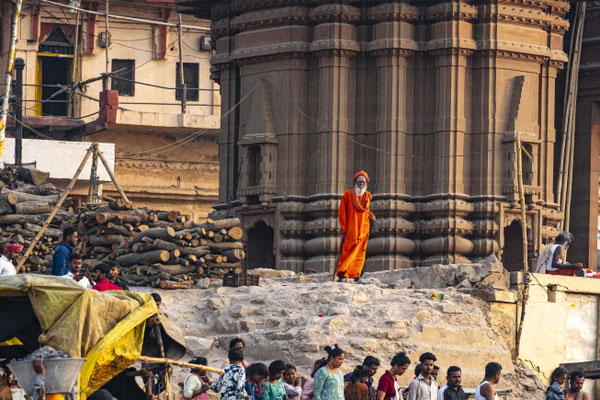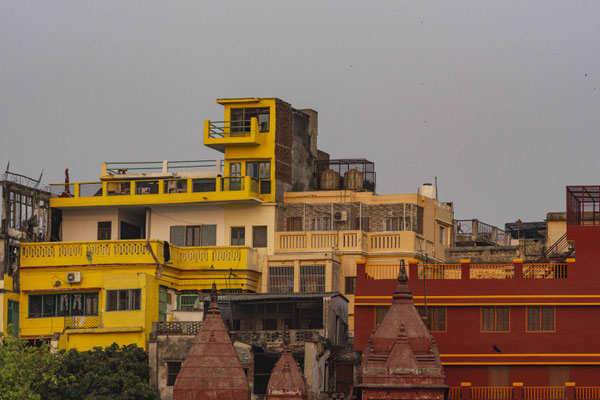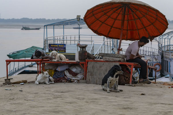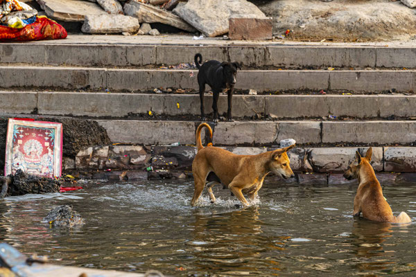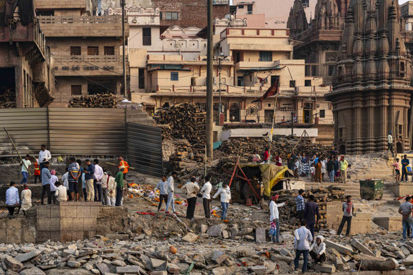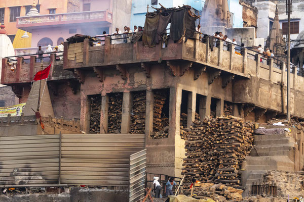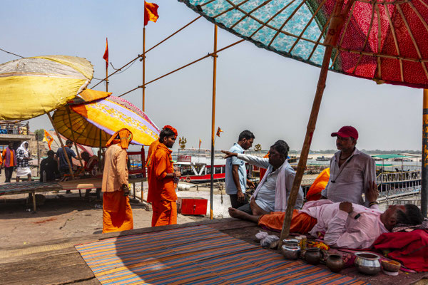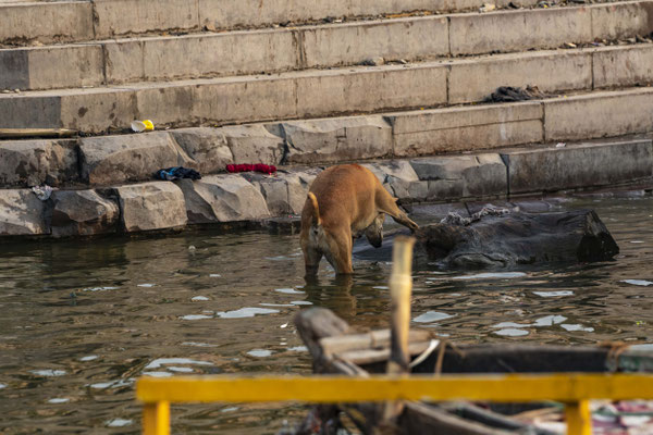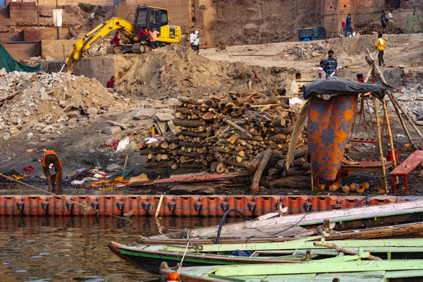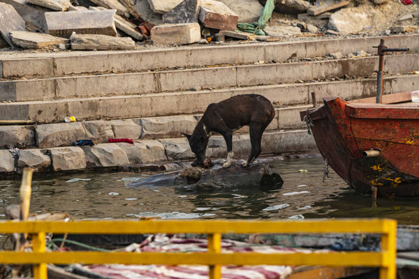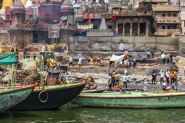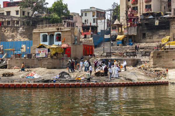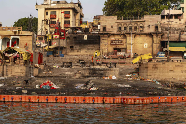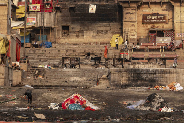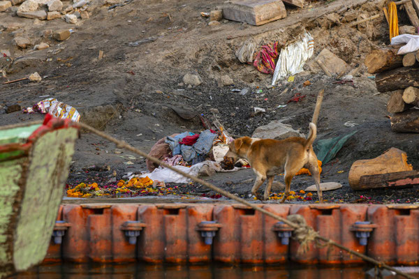 Varanasi, die heiligste Stadt der Hindus, liegt im Bundesstaat Utta Pradesh direkt am Ganges und hat etwa 1,4 Mio Einwohner. Sie ist eine der ältesten Städte Indiens. Seit mehr als 2.500 Jahren pilgern strenggläubige Hindus hierher, um im Ganges zu baden. Damit ist der Glaube verbunden, das Bad im Ganges reinige von allen Sünden. Als besonders erstrebenswert gilt auch, in Varanasi zu sterben und dort verbrannt zu werden. Damit soll der Kreislauf der Wiedergeburt unterbrochen werden. Sterbende werden von ihren Familien teilweise von weither nach Varanasi gebracht, um nach dem Ableben nach traditionellen Riten verbrannt zu werden. Deshalb sind an den kilometerlangen stufenartigen Uferbefestigungen des Ganges Ghats gebaut, an denen die Gläubigen für ein Bad Zugang zum Ganges haben. Weiter Fluss abwärts werden die Leichen der Verstorbenen öffentlich auf Stahlgestellen verbrannt und die Asche anschließend in den Ganges gestreut. Etwa 100 Verbrennungen sollen pro Tag stattfinden. Wir haben keine Verbrennung direkt beobachten können, das wäre auch reinster Voyeurismus, den wir uns nicht erlauben wollten. Auf einer Bootsfahrt entlang der Ghats waren aber die Verbrennungsstätten zu sehen. Ein Makabrer Anblick. Offensichtlich aber eine Touristenattraktion, die Hunderte gebucht haben. Besonders makaber war, dass sich Hunde die nicht vollständig verbrannten Reste aus dem Ganges geholt haben. So verbrennt offensichtlich das Becken einer Frau und der Brustkorb eines Mannes nicht gänzlich. Für uns unvorstellbar, aber hier in Varanasi ganz selbstverständlich.