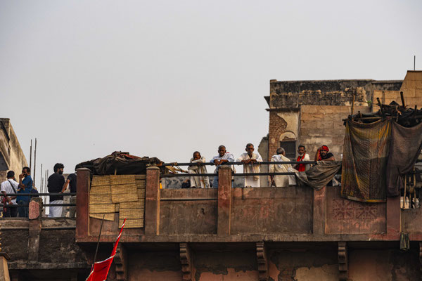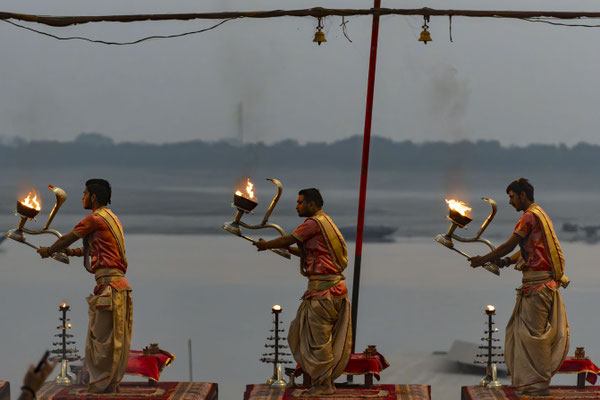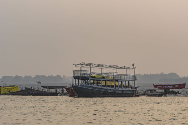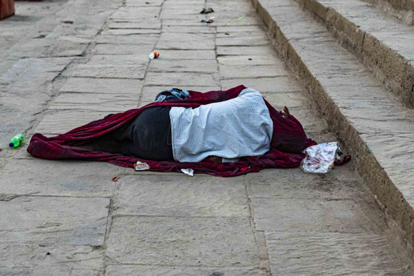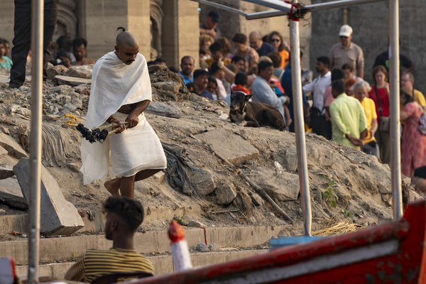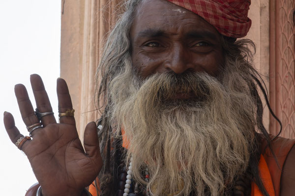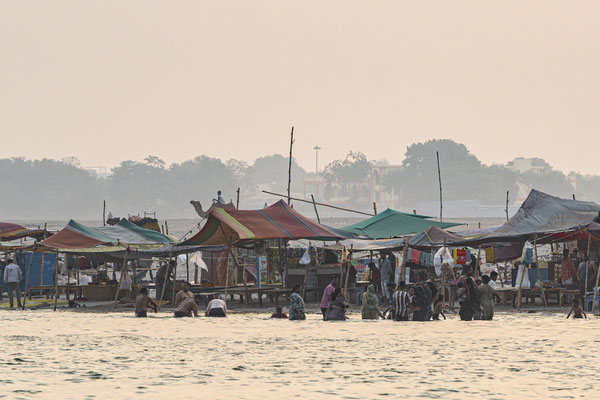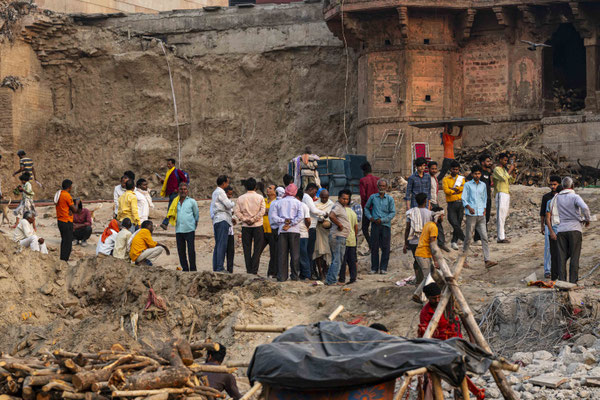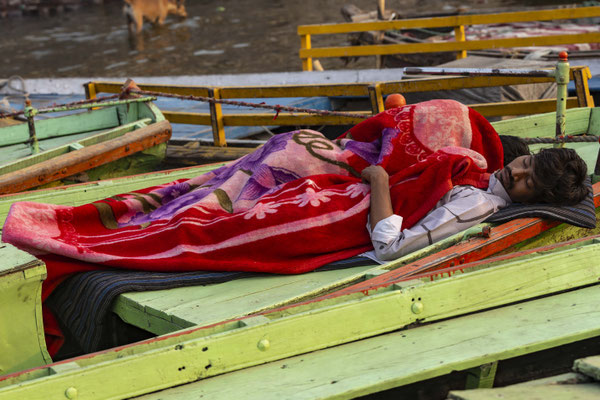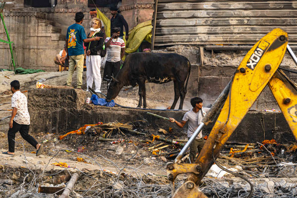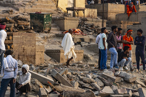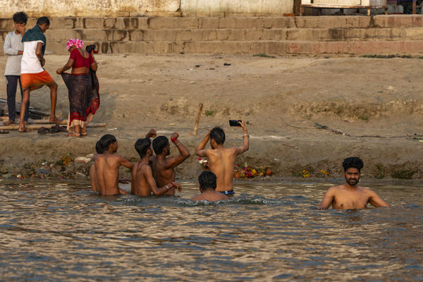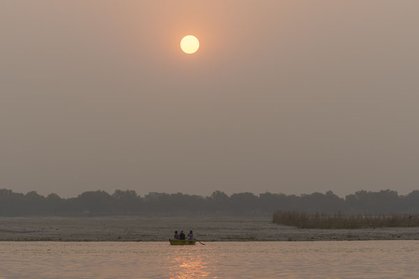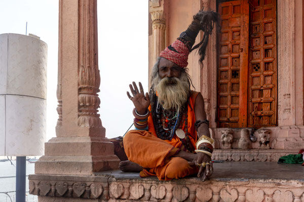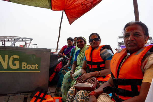 Varanasi, die heiligste Stadt der Hindus, liegt im Bundesstaat Utta Pradesh direkt am Ganges und hat etwa 1,4 Mio Einwohner. Sie ist eine der ältesten Städte Indiens. Seit mehr als 2.500 Jahren pilgern strenggläubige Hindus hierher, um im Ganges zu baden. Damit ist der Glaube verbunden, das Bad im Ganges reinige von allen Sünden. Als besonders erstrebenswert gilt auch, in Varanasi zu sterben und dort verbrannt zu werden. Damit soll der Kreislauf der Wiedergeburt unterbrochen werden. Sterbende werden von ihren Familien teilweise von weither nach Varanasi gebracht, um nach dem Ableben nach traditionellen Riten verbrannt zu werden. Deshalb sind an den kilometerlangen stufenartigen Uferbefestigungen des Ganges Ghats gebaut, an denen die Gläubigen für ein Bad Zugang zum Ganges haben. Weiter Fluss abwärts werden die Leichen der Verstorbenen öffentlich auf Stahlgestellen verbrannt und die Asche anschließend in den Ganges gestreut. Etwa 100 Verbrennungen sollen pro Tag stattfinden. Wir haben keine Verbrennung direkt beobachten können, das wäre auch reinster Voyeurismus, den wir uns nicht erlauben wollten. Auf einer Bootsfahrt entlang der Ghats waren aber die Verbrennungsstätten zu sehen. Ein Makabrer Anblick. Offensichtlich aber eine Touristenattraktion, die Hunderte gebucht haben. Besonders makaber war, dass sich Hunde die nicht vollständig verbrannten Reste aus dem Ganges geholt haben. So verbrennt offensichtlich das Becken einer Frau und der Brustkorb eines Mannes nicht gänzlich. Für uns unvorstellbar, aber hier in Varanasi ganz selbstverständlich.