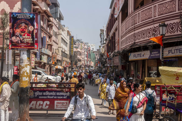 Die Stadt selbst ist schon anstrengend. Der gutgemeinte Tipp, sich relaxed durch die Gassen treiben zu lassen, war etwas realitätsfern. Man wird eher getrieben. In dem Labyrinth der überfüllten Gassen, meistens keine zwei Meter breit, steht oder liegt vorne eine Kuh, von hinten sucht ein Motorroller ein Durchkommen und direkt vor den Füssen - Achtung - Kuhfladen. Und das alles bei 40 Grad plus. Man ist also froh, dem Labyrinth irgendwann zu entkommen und wieder auf einer der quirligen Geschäftsstraßen zu sein.